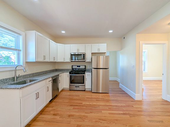 Modern renovation on the top floor of a triple decker house. Laundry in unit & central AC! Open kitchen and living room with recessed LED lighting and hardwood floors. The kitchen has granite counters and stainless steel appliances including refrigerator, stove, dishwasher, disposal & microwave. Both bathrooms have tiled oversize showers. All three bedrooms have large closets and the rooms can each fit a queen bed. Front & back porches just for this unit! On-demand hot water. Storage included. Cats ok. Just a 5 minute walk to the Union Square Green Line and convenient to multiple bus routes connecting to the Red & Orange Lines. Available September 1. One month broker fee. Tenant pays gas & electricity. One month broker fee.