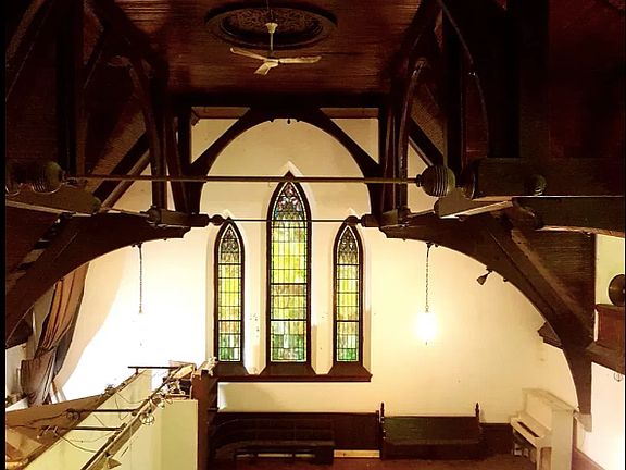The main floor has a large central hall, exposed wooden-trussed ceilings, a stage, work sink, studio walls that are drywall & plywood backed (which can hold fasteners snugly at any point), a decommissioned dumbwaiter, and a private room that was once used as a small church library.