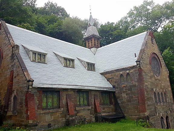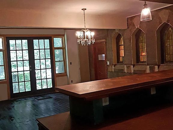 25+ foot high ceilings, hardwood floors, exposed stone, stained glass windows everywhere, authentic Victorian details throughout.