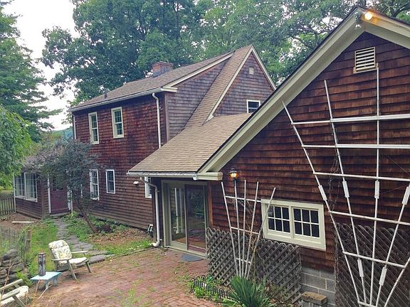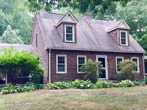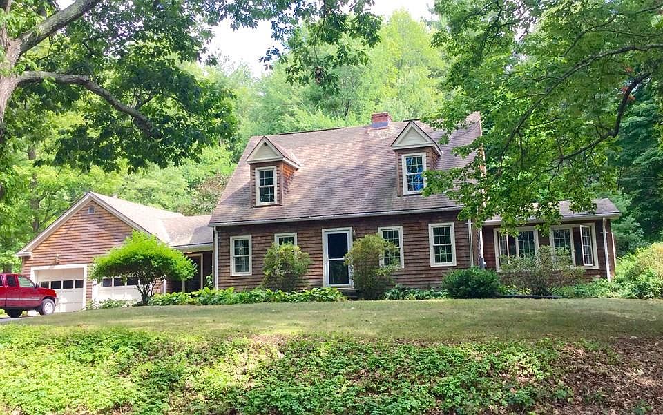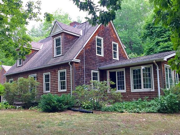SIMPLE COUNTRY COMFORT - Nature's beauty surrounds this charming Cape set on a quiet country road. Expansive, heated breezeway with atrium door leading to back brick patio can be used as a dining room or second living room, as it's open to the kitchen. The expansive feel to the front to back living room allows for a variety of seating arrangements around the wood-burning fireplace. French doors lead to lovely family room with windows on three sides overlooking the yard. A first floor room with closet could be an office or bedroom. First floor carpeting could be removed to unveil hardwood beneath...bonus! Upstairs the other three bedrooms have exposed wood and lots of storage in the nooks and crannies of the sloped roofline and dormers. Beautiful acreage with stone walls to exercise your green thumb, if desired, and a wonderful oversized outbuilding with many uses due to existing water and electricity was formerly a horse barn/workshop. Come explore the possibilities!
