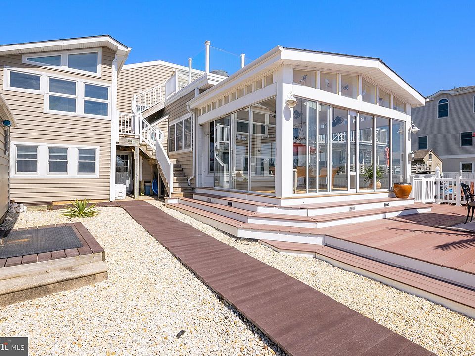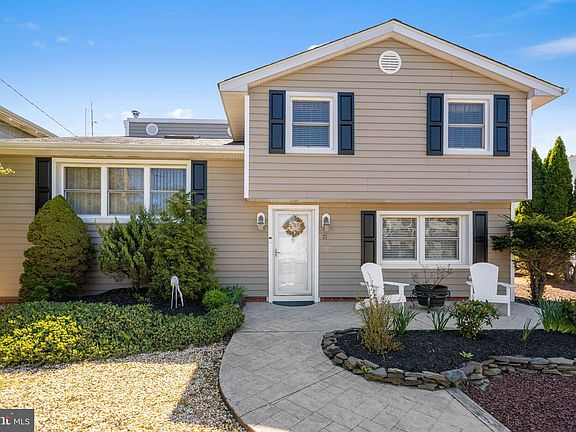 This bayfront beauty is a contemporary three-level split home situated on a lagoon, complete with a vinyl bulkhead and a fiberglass rooftop deck that offers breathtaking views from sunrise to sunset. Explore the features of this remarkable waterfront property. Water Views and Wildlife. Imagine waking up to endless water views, with the skylines of Long Beach Island (LBI) and Atlantic City in the distance. The area is teeming with nature's wildlife, including egrets, herons, and various bird species. 5 bedrooms and 2.5 baths plenty of room for family & guests. Enclosed Three-Seasons Glass Solarium equipped with free-standing gas fireplace controlled by a wall thermostat to cozy up during cooler evenings. The main level two bedrooms, full bath-tub-shower and dressing room ideal for a mother-daughter setup. The first level open floor plan spacious and elegant dining, electric mantel fireplace adds warmth & ambiance. Flowing into the eat-in kitchen featuring a center island with a built-in gas stove cooktop and seating for four. Cathedral ceilings with skylights in living room, cozy and inviting free-standing woodburning fireplace. The adjacent half bath is conveniently located. The third level 3 additional bedrooms, office/den or can be used as a nursery has a private entrance. The luxurious remodeled full master bath designed with roll-in shower with decorative tiled floors and walls, double bowl vanity, recessed touch lighting, equipped with music for a delightful shower experience. Outdoor amenities: unobstructed views, decorative palm trees that sway in the sea breezes from the "Great Bay", historical fish factory icon a piece of local history, the connecting landscape of Seven Bridges and Rutgers University Marine Field Station hub of marine research. Live and enjoy the waterfront lifestyle of all the unlimited activities of fishing, crabbing, swimming, paddleboarding, kayaking, and jet skiing right from your private backyard dock. This home truly captures the essence of waterfront living. It's a must-see for anyone seeking a serene and captivating retreat!