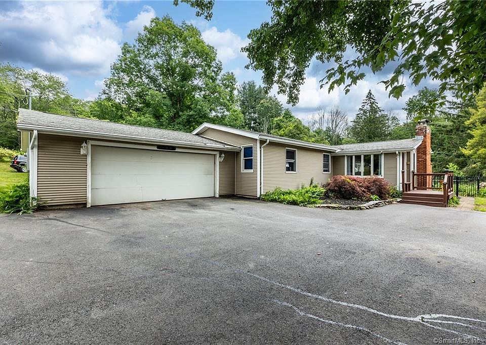 Multi offers, deadline for offers Mon 7/10 @ 6:00pm. Welcome to this sprawling Ranch in a great location near the historic Tolland Green! As you enter through the foyer, you'll be welcomed into the large fireplaced living room with hardwood floors & built-ins. The living room opens to the eat-in kitchen with a portable island, stainless appliances, granite counter & built-in wall oven as well as a separate range. Off of the kitchen is the half bath. A hall on one side of the kitchen leads to a full bath & three of the four bedrooms. Off the other side is the addition which was added to the home in the 1970's. This is where you'll find the dining/sitting room, full bath & the primary bedroom. A door of the dining room leads to the deck, patio & in-ground pool. The large basement has a second fireplace & can be finished to add additional living space. Outside relax by the pool & enjoy nature in your private backyard with mature fruit trees, gardens and a Kloter Farms shed & watch holiday parades go by from the front yard. Some updates to the house include granite counters in kitchen and fresh paint in bedrooms. Note: The town records list four bedrooms, however, the current owners are using one of these bedrooms as the mudroom & laundry room but it can easily be converted back to the fourth bedroom & the washer and dryer can be moved to basement where there is an additional laundry hookup in place. Conveniently located close to I-84, shopping, UCONN & many major amenities Price reflects age-related wear and tear; house has septic system however there is the option to hook into public sewer line; surveillance camera on garage & patio; There is a flue in the primary bedroom but there is not a stove at this time.
