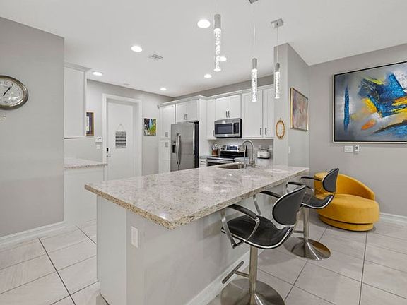 Courtesy of LPT Realty, LLC Gorgeous & desirable end unit overlooking green area. This is the largest model with spacious kitchen featuring white cabinets, quarts countertops, extra counter space, filtered water and water softener , all tiled downstairs plus storage/pantry, plantation shutters thru out, IMPACT WINDOWS and screened in patio. Extra large primary suite with huge custom walk in closet and primary bath. Upstairs loft and living area, upstairs laundry room with wash tub, extra storage and all wood vinyl flooring upstairs. Great central location close to equestrian venues,shopping, airport and beaches. Community pool, fitness center and clubhouse. HOA fees include basic cable/wifi