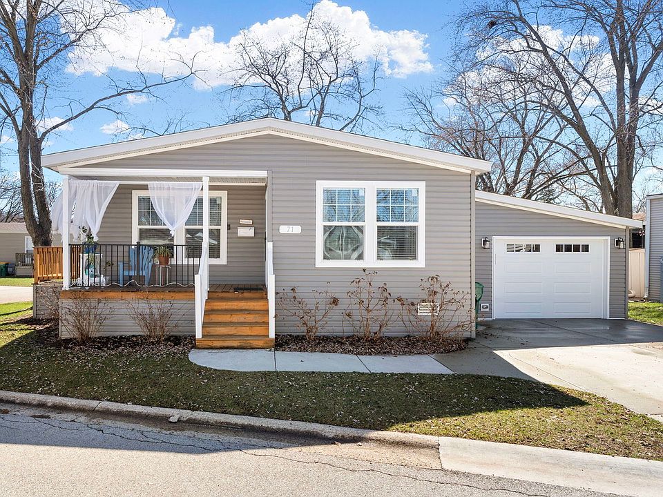 Beautiful corner unit for this manufactured home that shows like an updated and exquisite single-family home. Located in Willow Lake Estates in Elgin, close to everything. Built in 2020, this home features 1404 square feet with open concept and includes 2 generously sized bedrooms, 2 modern bathrooms, and a 1.5 car garage with a service door. Kitchen is absolutely gorgeous and offers a large granite island, plenty of counterspace, and black appliances including refrigerator, stove, microwave, dishwasher, disposal, and in unit washer and dryer. Living room is so bright and welcoming and flows into a covered deck with a view of the Fox River. Large primary suite has a breathtaking walk in closet and large bath with double sinks. Home has central air and heat. Willow Lake Estates is a 55+ community with 616 homes nestled along the Fox River with walking and bike trails nearby. The clubhouse and amenities include a newly renovated pool, a beach area for fishing or relaxing, and plenty of activities. Buyers must apply to be approved through Willow Lake. Set up your appointment today!