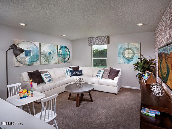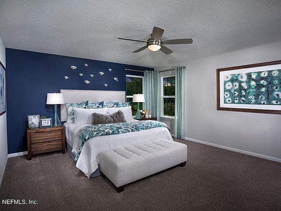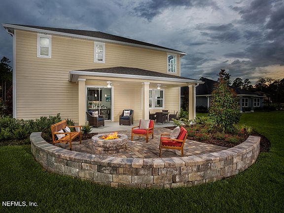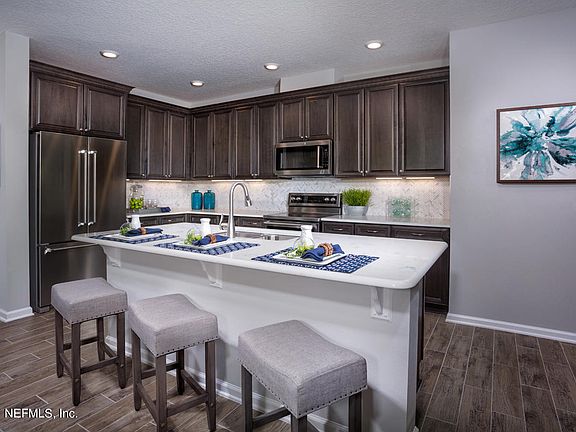 This gorgeous model home features a welcoming entry with beautiful stone accents and professional front landscaping for great curb appeal. This open concept floorplan features a kitchen with Kitchen Aid stainless steel appliances, dark Espresso 42'' Cabinets, and an expansive island with quartz countertops that is perfect for entertaining friends and family. The spacious owner's suite features a large walk-in closet, while the master bath boasts a walk in shower, tub, and dual sink quartz vanity. Wood look tile flooring flows throughout the first floor main living area with plush carpeting in the bedrooms and second story. Relax outside under the covered paved patio with a built in fire pit while overlooking a tranquil pond/preserve.