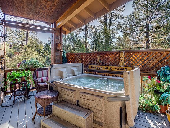 - Exterior Features: Covered Porch/Deck, Tall Pines on Lot, Storage/Utility Shed, Porch/Deck, In the Trees, Covered Patio, View of Mountains, Satellite Dish, Patio, Work Shop, Sprinklers, Spa/Hot Tub, Grill, Drip System