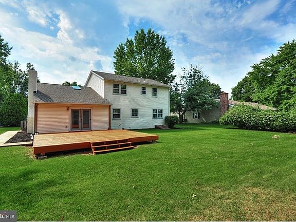 Meticulous five bedroom colonial with newer architectural shingle roof, central air, water softener, and expanded driveway. Welcoming covered front porch introduces the main level with original hardwood floors that carry from formal living with French doors to Dining Room. Laminate floors in foyer into kitchen with large pantry and built-in microwave and dishwasher. Family room has laminate flooring, brick wood-burning fireplace with built-in shelving, and ceiling fan, with another set of French doors to two-tier deck and level expansive yard. Large laundry room with utility closet separates kitchen and garage. Basement has Bilco doors for access to exterior along with new water softener. Oak-tred stairs to second level with Master bedroom with ceiling fan and bath, along with three other bedrooms and a bonus room with skylights with access to storage space above garage. Original hardwood flooring throughout upstairs as well. Established neighborhood with quick access to Routes 100 and 73.