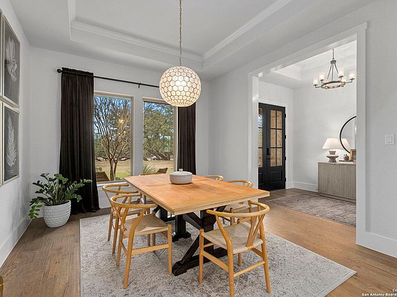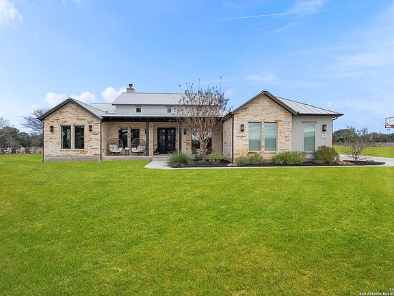 Modern ranch-style custom home on 4.21 acres in the gated community of Sabinas Creek Ranch, sits just outside of Boerne. This beautifully designed home features high ceilings, an open-concept layout, and a modern kitchen with a huge island, ideal for entertaining. Enjoy outdoor living on the back patio with a cozy outdoor fireplace overlooking your private field with expansive views. A rare blend of modern finishes, privacy, and Hill Country living, Horses and other animals welcome! Three car insulated garage with is own dedicated HVAC Unit.