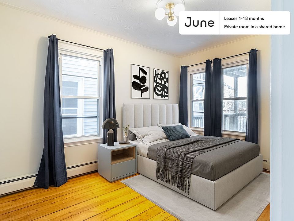 This Queen room in Roxbury is available on a 12 month lease or a flexible short term (31 to 364 days) lease. You pick your custom start and end date. Monthly rent rate is determined by furnishing preference, move-in date and move-out date. Speak to a June representative for recommendations on the best stay duration for the lowest rate.
