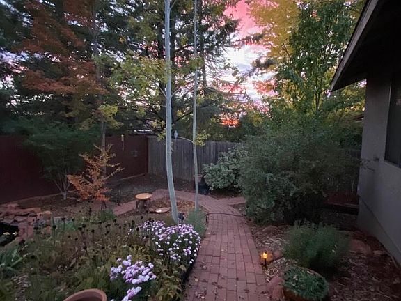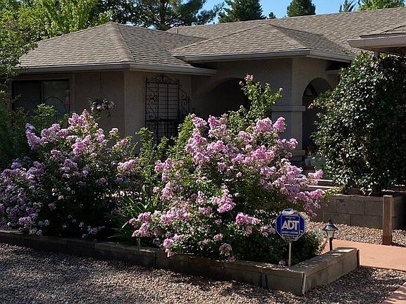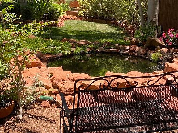HUGE PRICE REDUCTION OF 124K. Priced to sell ''AS IS'' at this price! 1 Level, split bedroom with family room. Chapel area. Underground utilities, paved roads, city services. Centrally located with only a five mile drive to either VOC or uptown and west Sedona. Excellent hiking trails! SFD #6. Hip roof w/ fire halt shingles. Covered, arched front entry. Vaulted ceiling in the open living room with beautiful wood burning fireplace, kitchen and dining with sliders to back patio, pond/waterfall, shade trees, beautiful perennial gardens, veg garden, small grass area and several seating areas with views of red rock mountains. 6' wood backyard perimeter fence. Side patio w/220 for spa. Vaulted ceiling Master with 7' double vanity, shower, walk-in closet. NO HOA, Short term rental OK