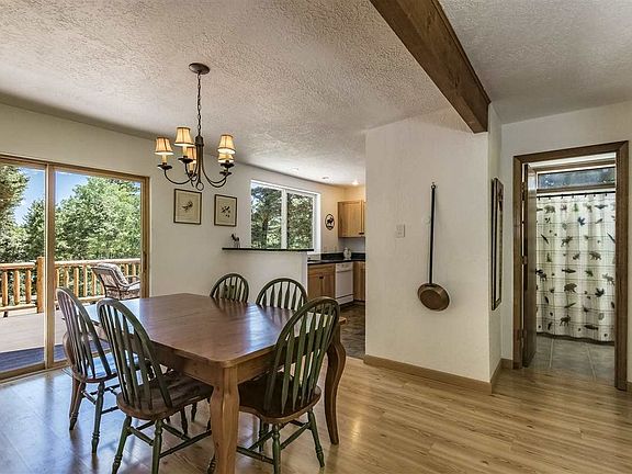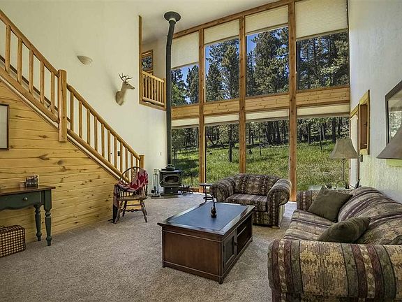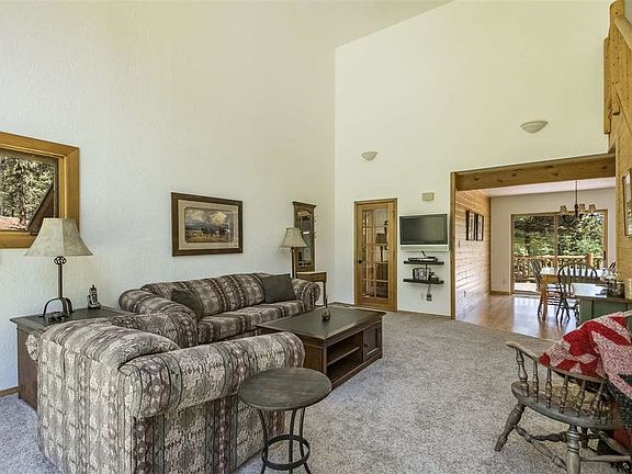 Check out this light and bright 3 bedroom/2 bath home/ 1 car garage home on over a half acre. There is a green belt/tract behind it for added seclusion. The layout is perfect as the master suite is on the main level with the two guest bedrooms and bath on the upper level. The upper level has a sun room with wall of windows off of one of the bedrooms. The kitchen has had a remodel with a large window over the sink and a bar separating the kitchen and dining area. The new stainless gas range and microwave and granite updates are a plus. The two story wall of windows overlooking the green space is a stunning entrance into the open living space. Plush new carpet anchors the living room. The custom log railing leading to the upstairs adds a real touch of mountain character. In the winter, the wall of windows serves as a passive solar heat source for the house. The wood stove in the living room is not only efficient, but beautiful as well. This mountain house has a great flow from the open living space to a large TREX deck with new custom log railing. The kitchen window serves as a great pass through to the BBQ area. The deck has expansive steel grates installed to carry the snow off the deck in the winter. This is a great outdoor space for entertaining. Fully furnished and accessorized without exception. This is a great location as it is close to everything with easy year round access.
