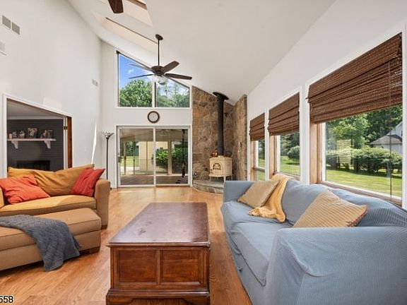 Open and airy floor plan that flows into the sun-drenched living room with a grand bay window open to the great room; floor to ceiling windows with beams of natural light, skylights, a vaulted ceiling with ceiling fans and a wood burning stove. French doors open to the family room graced with a gas fireplace, built ins for mudroom area, 1st floor laundry room. 3 season sun room. Kitchen features: stainless steel appliances, Viking double oven and is open to the sunny breakfast room. Slip upstairs to the Grand bedroom with a walk in closet and grand bathroom. Hardwood floors throughout, ceiling fans in every bedroom, recessed lighting and stone entryway.3 Attics for tons of storage space. Enjoy the backyard patio with over 1 acre plus room for a pool
