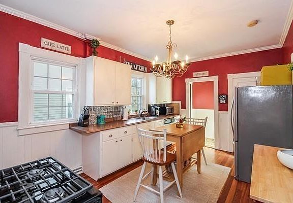 - Kit Dscrp: Flooring - Hardwood, Wainscoting, Gas Stove, Lighting - Overhead, Crown Molding
