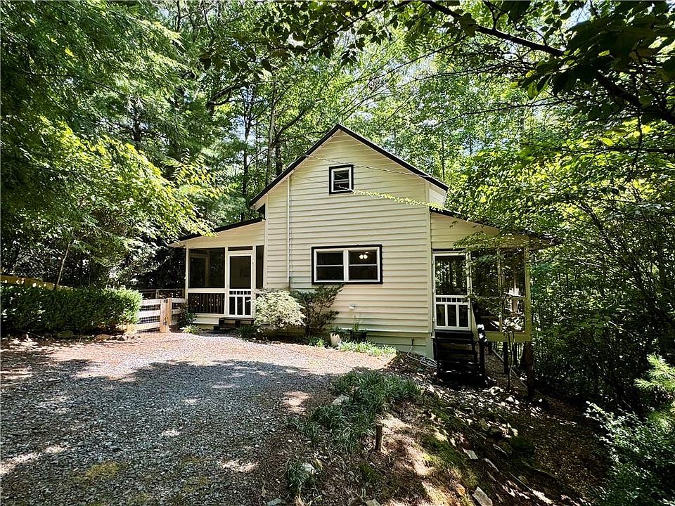 An oasis of serenity and solitude best describe this secluded rustic-farmhouse cottage in the woods. A long private driveway situated on over 2 acres. Seasonal mountain views, your own hiking trail on the property, whole house generator, fenced in yard for dogs, two screened in porches and a separate deck for grilling and entertaining around a fire pit. Home is being sold fully furnished whether you are looking for a second home or an airb&b, it's move-in ready. Home has been renovated with two gorgeous spa-like bathrooms, new windows, insulated metal roof, porcelain farmhouse sink in the kitchen and new lighting fixtures. The large screened in back porch is like being in a tree house and can accommodate several rocking chairs. You can hear the peaceful sound of Fightingtown Creek in the distance located just below the property. Minutes from downtown Blue Ridge with tons of shopping and restaurants, Lake Blue Ridge, Ellijay, wineries, white water rafting, hiking trails and waterfalls. It's the perfect mountain getaway. *Priced to sell well below area comps - don't miss this opportunity to own a mountain home in a sought after area*