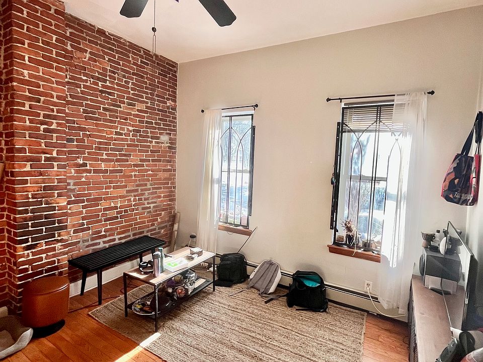 Exposed brickHardwood floorsLaundry in unitLarge bedroom