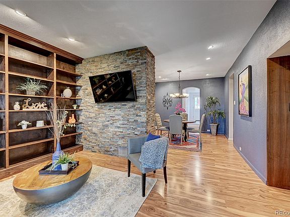 - Description: Comfortable Living Space With Stacked-Stone Wall And A Full Wall Of Built-In Shelving