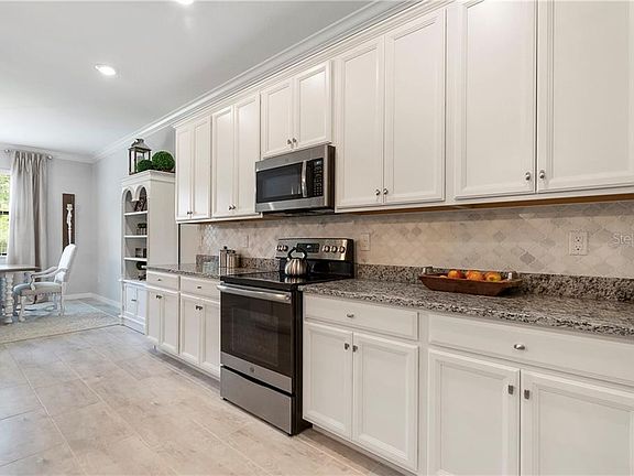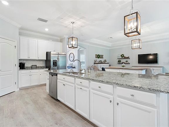 - Interior Features: Ceiling Fans(s), High Ceiling(s), Master Bedroom Downstairs, Open Floorplan, Split Bedroom, Stone Counters, Walk-In Closet(s), Crown Molding, Solid Wood Cabinets, Thermostat, Kitchen/Family Room Combo, Living Room/Dining Room Combo, Window Treatments, In Wall Pest System, Tray Ceiling(s)