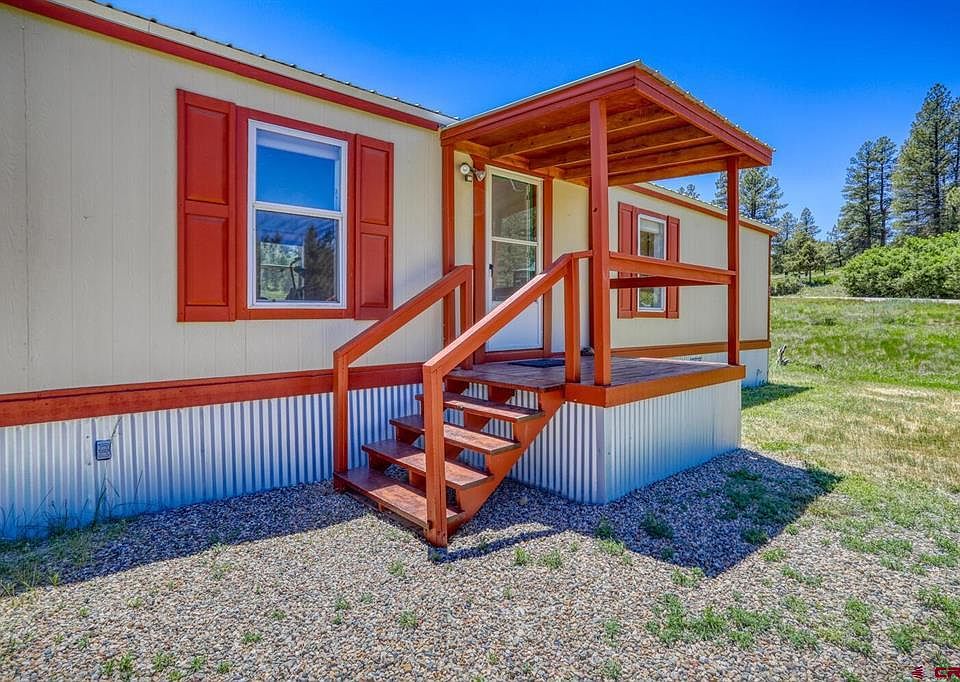LOOKING FOR A CLEAN AND TIDY HOME IN SOUTHWEST COLORADO WITHIN MINUTES FROM PAGOSA SPRINGS, Co.? Immaculate 1996 1016 sq. ft. single wide manufactured home on 1 flat usable acre with nice well established washed gravel driveway and easy year round access with no HOA breathing down your neck! (Archuleta County Building Restrictions do apply) This home has been updated inside and out!! New luxury vinyl plank flooring throughout the main living area, new upgraded carpet and padding in bedrooms to keep it cozy (No pets have been on this flooring), redwood covered front porch entry with hand rails, new forced air furnace in 2003, 2019 new paint throughout with custom wainscot in living area, 2023 new pressure pump for water cistern, most of the home has been taped and hand textured, for the furry friends or children the 3 rail fenced back yard with doggie door leading to back mud room with redwood flooring and electricity is a real plus, huge raised redwood deck in back of home with views of Broken off Point located right off of the insulated mud room, insulated metal skirting and metal roof for low maint., this home is light and bright with over 13 windows with nice views from every window, 1800 gal cistern for potable water, ANIMALS SMALL AND LARGE WELCOME. 1/4 mile to HWY. 160 and ONLY A SHORT apprx. 8 miles to downtown Pagosa Springs, Co. home of the HEALING WATERS HOT SPRINGS, WOLF CREEK SKI AREA , THE SAN JUAN RIVER AND 1000'S OF ACRES OF NATIONAL FOREST AND WILDERNESS LAND. PLENTY OF ROOM FOR ALL THE TOY's under the oversized metal car port. Easy to show call us today for a showing.
