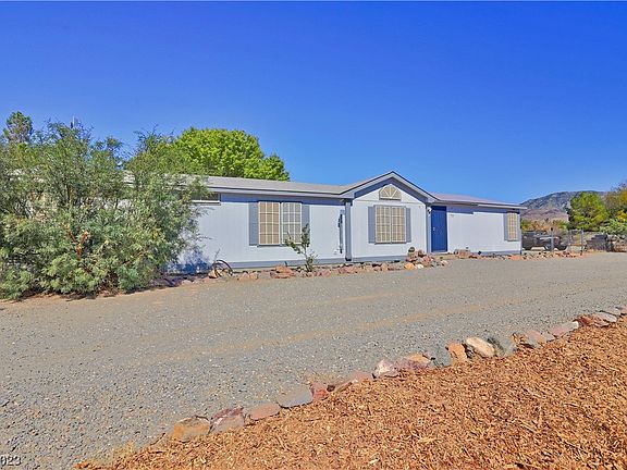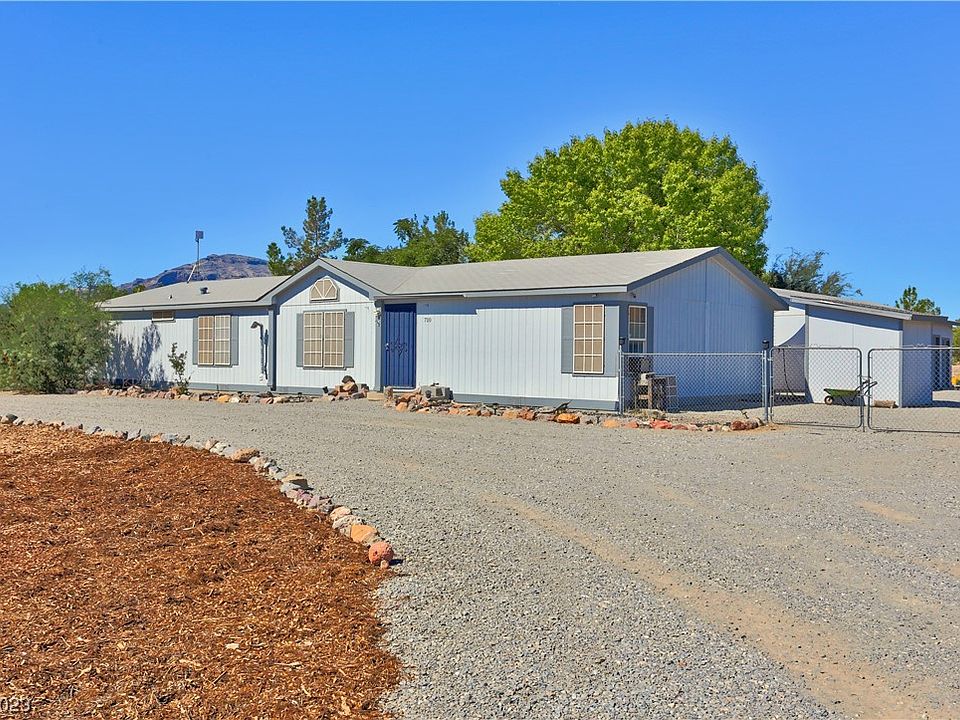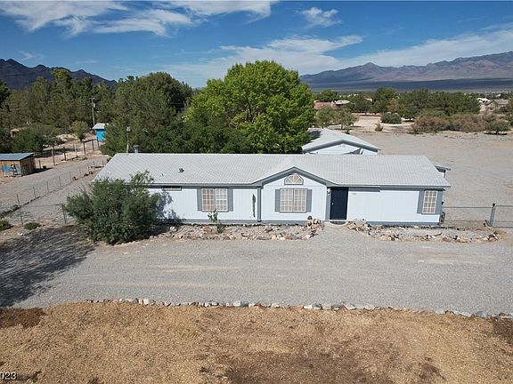 2.3 acre homestead on north end of Pahrump. Spacious home and garage providing plenty of room for all your family activities. Split floorplan gives primary suite privacy. Home has been updated with beautiful bamboo floors. Pellet stove in living room will heat the home. Separate family room has a fireplace flanked by window seats and French doors to close it off from the rest of the home. Two bedrooms and a bathroom open off the family room. Kids will love having their own space. The primary bathroom has a walk-in shower.. Island kitchen has ample counter space and cabinets, and all kitchen appliances stay. AC is only 1 year old. 40 x 24 garage has 3 roll-up doors, workshop space and a restroom. Mature shade trees create a cool back yard with garden space. Large fenced chicken yard and coop and 2 storage sheds. Property is fully fenced with 5' chainlink. Located on quiet street with terrific mountain views in every direction.