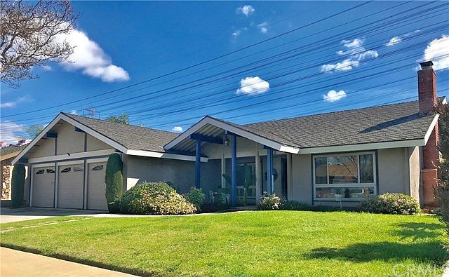 Welcome Home to an Entertainer's Delight! A semi-open floor plan boasts of 2,070 SqFt, 4 BEDROOMS, 2 BATHROOMS and a 3 CAR GARAGE. Freshly painted and designer wall coverings to accent the tile flooring. Scraped ceilings w/recessed LED lighting, Dual Paned Windows & French Doors add a bright atmosphere. The entry is dramatic with a semi-formal living room, fireplace and a picturesque window. A spacious eat-in kitchen has new SS appliances & hardware, custom light wood cabinets, Gas Stove, New Glass back splash & New garbage disposal. The family room has a large custom bar w/ lighting including 3 original stools & extras. There is a Master Suite and 3 additional bedrooms w/ a guest bath. The Master is spacious & includes a walk-in closet with built-ins, new mirrored vanity/make up area with accent lighting. Bathroom includes dual sinks with designer fixtures, granite countertop, shower, travertine floors & a comfort-height toilet. The Guest bath has a custom mirrored vanity with granite, high end fixtures, tub/shower combo and a washer & dryer with storage above & access to the backyard. The guest bedrooms are spacious with closet space (2 are walk-in) and are light and bright. The 3 Car Garage has built-in storage, newer garage doors. The Landscaping is easy to maintain & nicely filled out with large trees, lush plants and a private backyard with patio. Invite your friends to this great home with spaces to entertain and enjoy for many years! A MUST SEE!