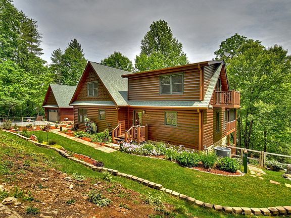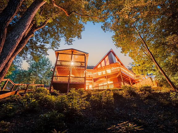 FABULOUS FIGHTINGTOWN CREEK CABIN...this 3-4 bedroom/3.5 bath rustic home is perched on gentle banks of noisy trophy trout stream...cozy & unique, it offers open living/kitchen/dining area with wall of glass overlooking creek, double sided massive stone fireplace, soaring ceilings & exposed beams, chef's kitchen with granite counters, plentiful cabinets & stainless appliances, master on main with ensuite bath, plentiful porches with inviting entertaining areas along with outdoor fireplace, lovely oversize loft provides great home office, exercise or flex space, terrace level offers full guest quarters, den, storage, laundry & more, walk out patio leads to short walk to water's edge swim dock with easy access for fishing or swimming, lush manicured landscape for ultimate curb appeal, greenhouse & terraced garden area provides storybook setting, detached garage & gated driveway, tucked away & private with exceptional mountain and water views, yet conveniently located near historic downtown areas...tastefully furnished for turn key purchase and perfect for comfortable full time home...bring your fishing poles!