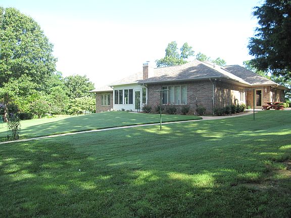 Home is located on 8.5 acres on a dead-end road and has a very private setting with lots of wild life and green space and is located three miles from Bull Shoals White River State Park with access to Bull Shoals Lake and the White River in Arkansas. It is well constructed with brick veneer all around ,Pella windows, 8 feet high garage doors with an oversized 620 square feet 2 car garage and 9 feet high ceilings. The home has one year old roof shingles. Inside the house are ceramic tile, real oak hardwood and carpet floors. The kitchen features granite countertops and white appliances. There is no basement but an 4'-6" high storage area under the full floor area of the home. Included are a sun room with skylights and three more skylights in the homes interior and a wood burning fireplace, also a central vacuum system plus alarm system and twelve closets.For all the outdoor toys and yard equipment there is a 24' by 36' shop building with water,electric and a seasonal washroom.