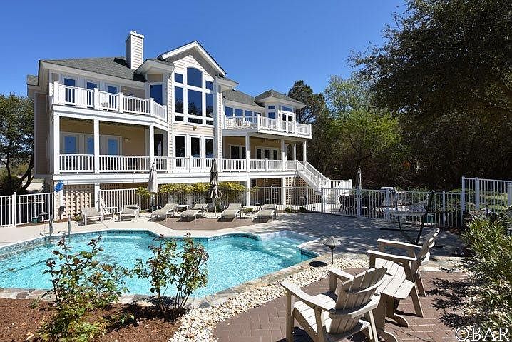 Golden Retreat is a stunning luxury golf and sound front retreat with extensive upgrades for those with discerning tastes. This expansive home features amazing views that overlook the 16th fairway and the Currituck Sound. With the reverse floor plan the large open great room has picture windows providing stunning views. The house is located away from other homes offering unparalleled privacy. State-of-the-art electronics, home theater, DVD library, surround system throughout the home, pool table and a separate kitchen in the rec room provide the ultimate in relaxation, or stay fit using the fitness equipment. The elevator provides easy access to all levels of this elegant home. On the ground level there is a master bedroom/home office with a Daybed (converts to a King) plus master bedroom with two Twins. Extensive decks provide ample options for entertaining or relaxing. Or just enjoy the private pool and hot tub. The home is part of the award winning golfing community; "The Currituck Club", showcasing an 18 hole Rees Jones designed links style golf course that is also an Audubon Society Cooperative Sanctuary. This gated community offers a restaurant, fitness center, outdoor pools, lighted tennis courts, basketball and volleyball courts, trolleys, and a full array of resort services and activities. If you are looking for sumptuous accommodations in an area known for its water fowling heritage, expansive beaches and beautiful sunsets, Golden Retreat will be the unreserved answer. Additional notes: (1) GARAGE has 3 bays; 2 spaces for cars, and the third for a golf cart. (2) INSIDE : 2 jet Tubs and 2 gas Fireplaces; a water softening system with reverse osmosis purification; ABus sound system outside and inside, all rooms have SMART TVs and DVD players, lower level includes Treadmill and exercise equipment. (3) OUTSIDE: built-in stone gas grill, upscale exterior furnishings (Jensen Jarrah teak furniture and Tropitone sling mesh furniture around the pool), Irrigation system operates from well water.