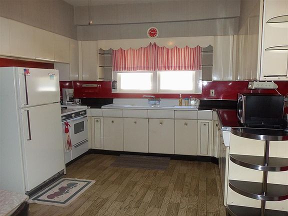 Cute little beginner home or a rental property. With 2 bedrooms, 1 bath and a large walk in closet in master bedroom. Kitchen has beautiful old modern metal cabinets and range stays with home. Detached garage with door opener and utility with washer & dryer. Freezer in basement. No warranty on appliances. Located close to grocery and down town.