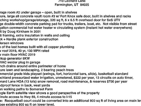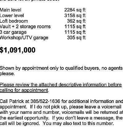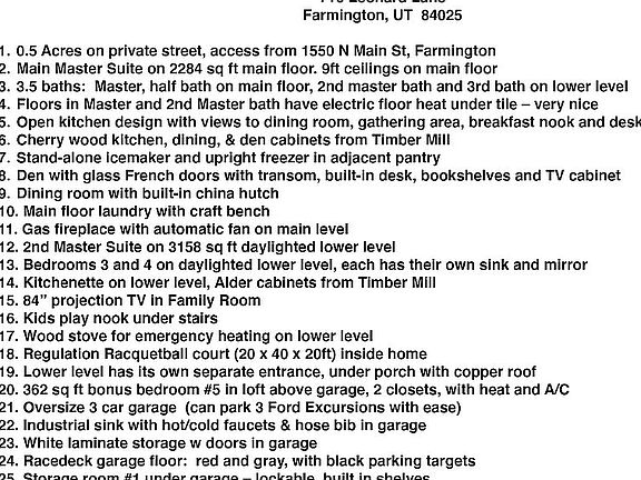 Executive home on private street in North Farmington. Custom built in 2001. 0.5 acre lot with mature landscaping. 2 minute access to Hwy 89, 4 minute access to I-15. 5 Bedroom, 3.5 bath, regulation racquetball court, 3 car oversize garage, 3 storage rooms under garage including large secure vault with Ft Knox safe door, RV parking pad, matching shop w rollup door for UTV, See attached sheets for additional home features, layout, and photos. Shown by appointment only to qualified buyers. Calls from agents with fully qualified buyers in hand will be graciously received. Call Patrick at 385/522-1636 for appointment.