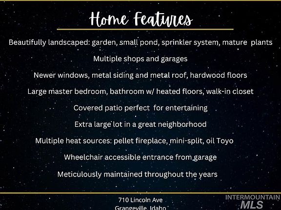 This meticulously cared for, tri-level Grangeville property simply overflows with charm and gorgeous landscaping, mature trees, plants and a serene mini pond. The main floor has beautiful hardwood floors and living room has a cozy pellet fireplace & mini split. Just off the living room is the dining area and kitchen w/ breakfast bar. Laundry w/ wash station and storage is on the main floor along with an office, and a bathroom with handicap shower. The spacious master suite has access to the outside, a large walk-in closet w/ pass through to the laundry area. The bathroom has heated tiled floors and plenty of storage. The upstairs has 2 bedrooms w/ large closets and one room featuring a loft area! Downstairs is the perfect den area for movie night or bring in a pool table! Main 2 car garage has a ramp, pantry, and a full bathroom. Behind the garage is a wood shop area w/ garage door for easy entry or park your UTV. The backyard has a second shop w/ wood stove and plenty of storage for vehicles or toys!