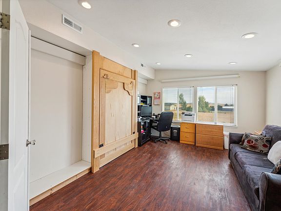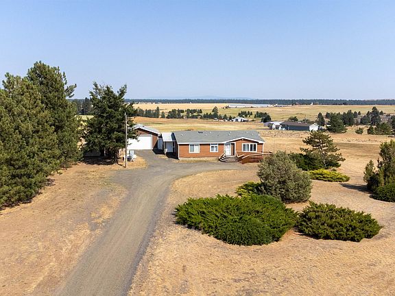 This spacious home has everything you need for one-level living. Upon entering the home there is a spacious entry way and an office/den to the right. The office has a built in murphy bed to turn it into an instant guest room or potential 4th bedroom. Large kitchen with island and pantry. High ceilings throughout the home make it light and bright. Large Primary bedroom includes a full bathroom with double sinks and walk-in closet. From the exterior you can take a breezeway to the 2+ car (heated) garage/shop and avoid the weather. The garage is over-sized with lots of storage and built in workbench plus has the higher door for taller vehicles. One of the outbuildings has been wired for a fusebox. Plenty of land for gardens, or toys to pursue your dreams. Brand new mini-split furnace system with new venting was installed last year. Tradewinds Life Breath air quality system installed in home. Roof is approx 10 years old. Well approx 5.6 gpm. Only 25 minutes to downtown Spokane and 17 minutes to the airport.