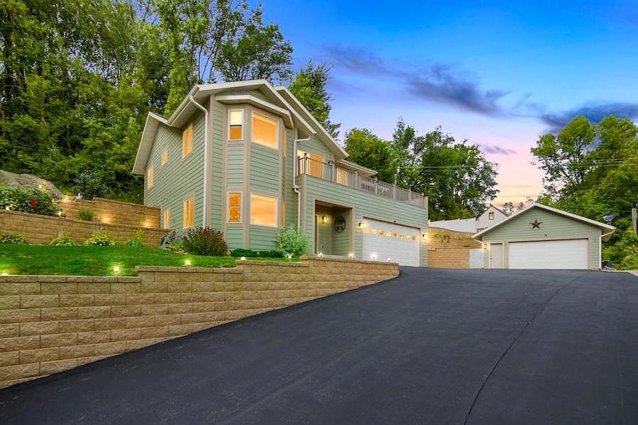Gorgeous views of the city and surrounding bluffs with a private country setting on 1.5 acres with the convenience of living in town. Almost new 4 bedroom 3 bath home with vaulted ceilings, custom ceramic tile and granite counter tops gives this home class while the hard wood flooring makes it warm and inviting. Open concept living area includes the kitchen with custom maple cabinets, stainless steel appliances and opens to the living/dining area with 9' vaulted ceilings, composite decking plus an extra large two car detached garage for all your toys. Brand new retaining walls and driveway. 38x14 patio nestled between the house and the woodline. The view from the firepit is amazing! Over $105,000 in improvements in last 2 years.