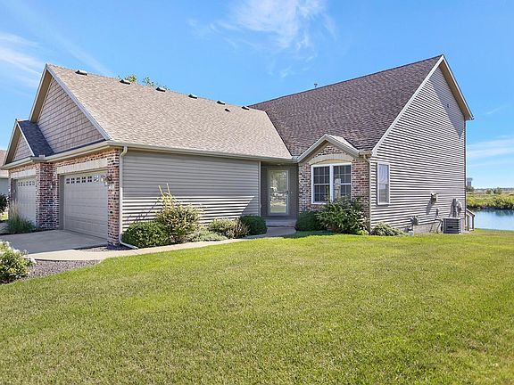 Sprawling 1.5 story Zero lot home on the LAKE!! 1st floor Primary bedroom with full bath and walk in closet. Stone and Brick accents on the front as you walk up to the home. Soaring Vaulted ceilings as you enter with the majestic staircase rising above. Dont miss the Fireplace with jacks already set for your wide screen TV. Well appointed Kitchen with loads of cabinet space and Center Island. Upstairs is 2 more large bedrooms with a full bath and sitting area. Full basement await for extra storage, add on bedroom and full bath. Spacious Garage with freshly painted epoxy floor! Go outside to the sprawling Deck overlooking the lake beyond which is beautiful. This home has it all with great landscaping as well. Dont miss it!!