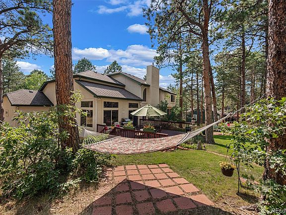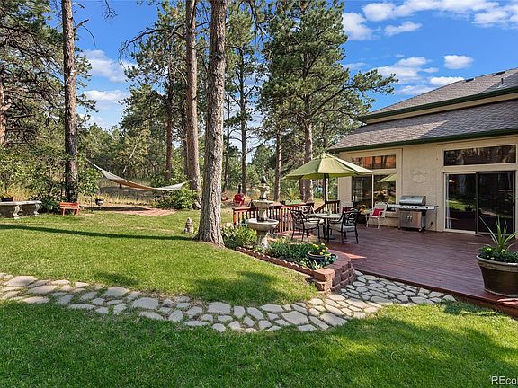 Truly magnificent Woodmoor 2-story on .62 Acres with charm & quality throughout. Residing in Monument's most coveted area - Woodmoor Vista (you'll know why when you drive the tree-lined streets). With a rare main floor master, there is plenty of space to spread out. The quality and richness is apparent featuring vaulted ceilings, Hardwoods and tile throughout the main with granite window sills and high-end wood windows and Hunter Douglas Vignette Roman shades. Open concept kitchen features succulent cabinetry with glass inlays, granite countertops/backsplash, granite sinks, service bar and a large, kitchen island with gas stove. Huge Pantry! A floor-to-ceiling brick fireplace in the great room sets the stage for entertaining guests or settling in on a cool evening. Plenty of windows in every room - view your wooded lot from every angle. Lush landscaping for amazing curb appeal. The master bedroom has wood floors, large bay window, 2 walk-in closets and on-suite, fully updated, 5-piece bath (feels like a spa). Upstairs, you'll find 3 more bedrooms: 2 are adjoined by a jack and jill bathroom-the 3rd has its own hall bath - divine floorplan. Venture to the garden level basement for finished recreation or play space with an extraordinary, wood-planked wall with a stone inlay for the wood burning stove. Plus another bedroom and full bathroom. Need storage, this basement has 2, large, unfinished storage areas. Sit outside on your backyard deck overlooking an oasis that beckons outdoor entertainment or BBQ's. Lush landscaping, pine trees and beautiful flower gardens at every turn. An idyllic "she or he shed" completes the outdoor picture. (It is dressed up now as a play house). Meticulous care shows throughout this property. Newer water heater and Impact Resistant Shingles. Convenient location - easy access to I-25 and Highway 83 - Colorado Springs or Castle Rock just 20 min. Walking or biking trails are nearby for outdoor activities. You can't ask for more.