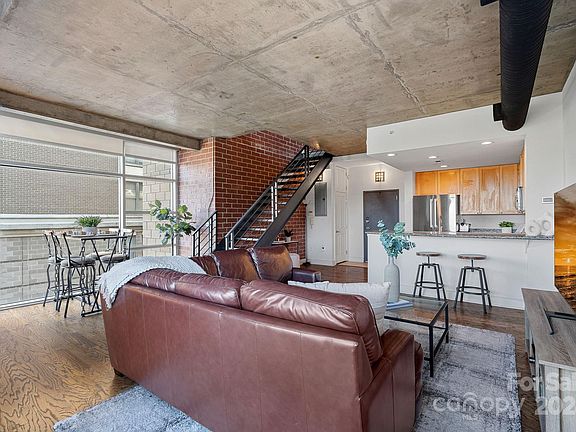 RARE large corner unit in the heart of Uptown Charlotte! Located on the 5th floor- this two-story unit offers views of the city skyline including the Panthers stadium. With industrial flair, this condo features exposed brick and concrete walls. You'll also find hardwood flooring, granite countertops, SS appliances, and more. The main level features a spacious kitchen, living, and dining area filled with natural light and an abundance of windows for beautiful city views. Head upstairs to your expansive primary bedroom, lounge area, and full bathroom with a large closet. Ample space for a work-from-home setup! Reserved same-level parking spot and CityLYNX Gold line access right outside your door! Schedule a showing today and start living that Uptown lifestyle!