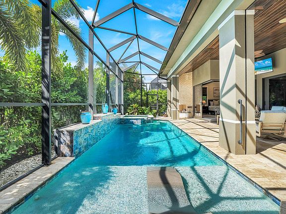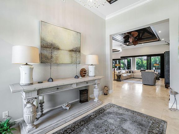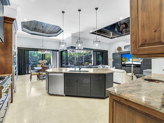 Stunning 5-bedroom, 4-bath custom home just half a mile to South Beach access and minutes from shopping, dining, and the movie theater. This beautifully designed custom built residence features soaring ceilings, impact windows and doors, travertine tile throughout, and a spacious split floor plan with a primary suite plus den on one side, and three en-suite guest bedrooms on the other. The gourmet kitchen includes a gas cooktop, large island with abundant storage, walk-in pantry, and built-in bar with wine cooler. The living area impresses with 90-degree sliders and a custom wood-inlaid decorative ceiling. The primary suite offers corner sliders, his-and-her California closets, a spa-style bath with large walk-in shower, dual vanities, and private commode. Step outside to a spacious lanai with outdoor kitchen, electric shutters, and a private pool and spa with 3 waterfalls, surrounded by lush privacy hedges. Also features a pool bath, epoxy-coated garage floors with custom storage, and both a circular and side driveway for added convenience. Turnkey furnished and ready to move right in!