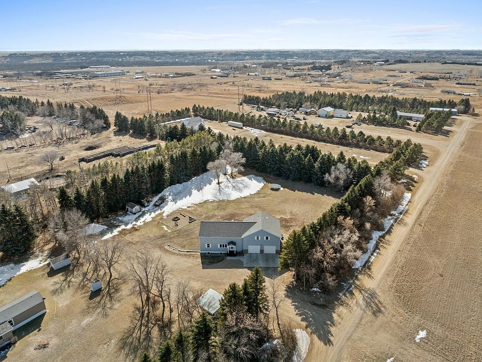 Escape the city and embrace country living with this incredible 2.34-acre retreat, just minutes from Minot! Surrounded by mature evergreens, this unique property offers privacy, space, and breathtaking natural beauty - just five minutes from Nedrose Elementary and Nedrose High School. Step inside, and you'll be stunned by the open-concept design, featuring an elegant open-railing staircase, soaring knotty pine ceilings, and an abundance of space. The kitchen is a chef's dream, boasting rich cherry-colored cabinetry, a gas range, a walk-in pantry, and a modern subway tile backsplash. Flowing seamlessly throughout the kitchen, dining, and living areas is classic light-colored bamboo flooring. The dining space extends onto a large deck and concrete patio - perfect for taking in the serene backyard views. The main floor also includes two spacious bedrooms, an updated bathroom, and a convenient laundry area. Upstairs, the primary suite is nothing short of spectacular - nearly 1,000 square feet! This luxurious retreat showcases knotty pine ceilings, bamboo flooring, his-and-hers closets, and a private ensuite with a jetted tub and separate shower. Two additional bedrooms and a third bathroom complete the upper level. The recently finished basement is designed for comfort and entertainment, featuring in-floor heating, soaring nine-foot ceilings, and three large windows that flood the space with natural light. A supersized sixth bedroom and a fourth bathroom round out this level. The oversized 32x34 garage is equipped with in-floor heating, a floor drain, and abundant cabinetry for storage. Outdoor highlights include: A large dog kennel, extra storage shed, firepit area, bonus well for outdoor watering, beautifully upgraded landscaping with retaining walls & hundreds of mature trees for unmatched privacy. This rare find is truly a slice of heaven - schedule your showing today!
