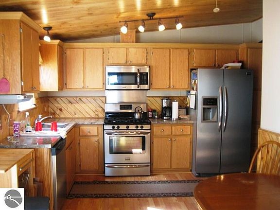 Almost like new home with some custom touches such as a very large living room with gas fireplace built into an attractive wall of stone and a bedroom/bath on each end and kitchen with stainless appliances. Home sits on a full basement with the laundry area and 2 partitioned rooms. 24x32 pole building/garage with drive thru doors, woodburner, attached wood shed and 16x32 attached leanto. 16x30 pole building with 16x30 attached leanto. Lots of great storage space all on 5 wooded acres! Hard to duplicate at this price!