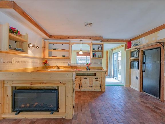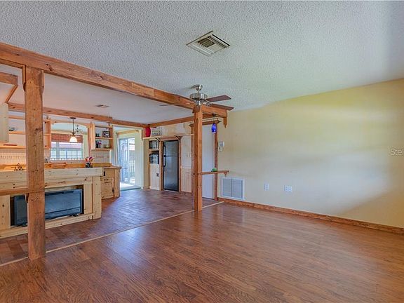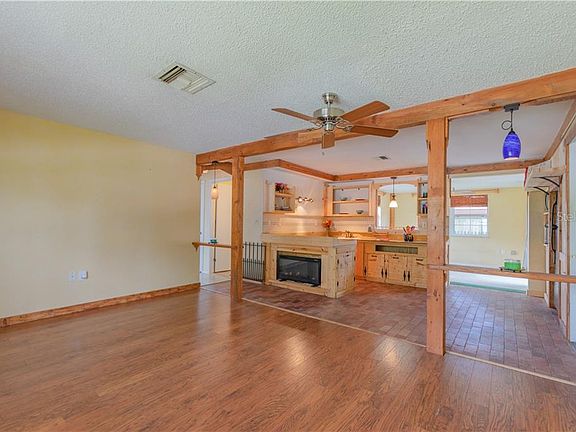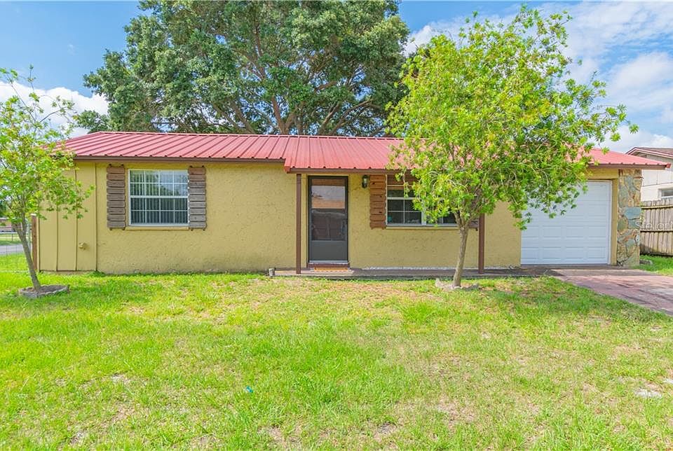 Fall in love with this charming, Port Richey home in Embassy Hills. Unique handmade wood accents adorn the walls throughout. Enter into the spacious living room and you are greeted by an open floor plan with a view of the custom-made dine-in kitchen. The bathroom is relaxing with clean white shower tile and hand-crafted wood accents. Exiting through the sun-filled family room leads you to a luxurious outdoor living area featuring a pergola with retractable awning and a view of the property's large, fenced-in yard, green grass and mature landscaping for plenty of shade! There is also tons of storage thanks to an attached one car garage a large detached carport. Additional updates include a long-lasting metal roof installed in 2010. Come add the finishing touches and make this home your own!