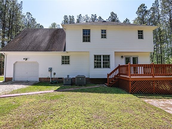 Beautiful 4 bedroom 2.5 bath Colonial in Prince George County full of charm & situated on a over 5 acres with detached garage. Step up onto the large full country front porch and into the homes foyer with hardwood floors. Family room with wall to wall carpet, ceiling fan, gas fireplace & deck access. Large eat-in kitchen features hardwood floors, lots of counter & cabinet space, breakfast bar, metal backsplash, stainless apps, pantry & garage access. Dining room has hardwood floors & chandelier. Off the kitchen is the utility room with built in shelving 7 half bath. Upstairs the primary suite comes complete with wall to wall carpet, ceiling fan, walk-in closet & sliding door closet, private bath with dual vanity & tub/shower combo. Bedroom 2 with carpet & single door closet. Bedrooms 2 & 3 both with carpet, ceiling fan & single door closet. Additional full bath with single vanity & tub/shower combo. Home also features freshly painted interior, attached 1 car garage with work bench & built-ins, detached 2 car garage, back deck & patio area & multiple detached sheds for extra storage all on a private 5+ acer lot! Make this country oasis yours but don't wait, this gem won't last long!