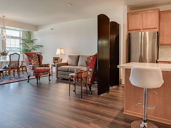 Newer Edina 55+ executive condo building. Almost like resort living. The building has an indoor pool, hot tub, sauna, movie theater, pub, party room, exercise room, and golf simulator. The unit is 1197 ft.² and has one of the best views in the building! It also has been upgraded with new flooring, quartz counters, lighting, and glass tile backsplash. Meticulous condition!