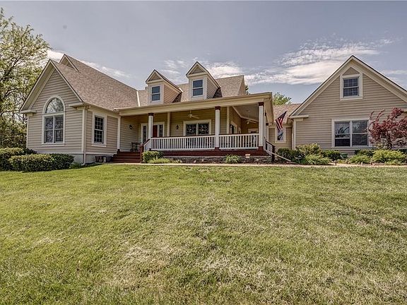 Magnificent custom-built Ranch on a picturesque corner lot just over 4.5 acres. Enjoy morning coffee and the view of Shawnee Mission Park on the wrap around front porch. Step inside to discover a world of elegance, where hardwood flooring graces the entryway, leading you into a living space adorned with soaring ceilings and a captivating stone fireplace by Kozy Heat, complete with a built-in automatic 3-speed fan for added comfort. Prepare gourmet meals in style within the chef's kitchen, a culinary haven boasting granite counters, a gas stove, stainless steel appliances, an island, and a generously sized pantry. The refrigerator is included for convenience. Whether hosting intimate gatherings or grand soirées, both a formal dining room and a spacious breakfast area offer ample space for entertaining family and friends. Top of the line Weathershield wood windows throughout the home ensure both efficiency and aesthetic appeal, while the four seasons room beckons with its stunning tongue and groove ceiling. The spacious master bedroom suite is a retreat of its own, with a vaulted ceiling, a sizable walk-in closet, a beautiful walk-in shower, and dual vanities. Ideal for overnight guests, a secondary bedroom with a walk-in closet and access to a full bath ensures comfort and privacy. Main floor convenience is elevated with laundry facilities off the kitchen with the washer and dryer provided. The bonus room above the garage, with added insulation in the floor, presents a canvas for your personal touches, while the unfinished basement offers boundless potential for expansion, with plumbing stubbed bath. Fenced area with large concrete patio. An oversized three car garage with 9-foot doors provides ample space for storage, especially for outdoor lawn equipment. Meticulously crafted with numerous upgrades and meticulous attention to detail, this remarkable home effortlessly blends luxury, functionality, and style, offering an unparalleled living experience.