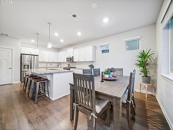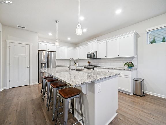New Price! Newer Meticulously Maintained English Style Home in Tualatin! Energy efficient with all the upgrades and landscaping. Modern light & bright open concept with gourmet kitchen with oversized granite island, gas SS appliances, large pantry, gas fireplace all overlooking tree views. Upstairs has 4 bedrooms with a large primary suite with walk-in closet, double tile vanity, and linen closet. Rare 3 car garage, fenced upgraded landscaped backyard with raised garden beds, added concrete walkway, all energy efficient systems such as tankless water heater, and gas furnace/ac. Excellent location with walking trail behind home and Atfalati Park off Sagart, easy access to highway, hospitals, parks and shopping.