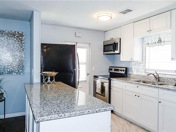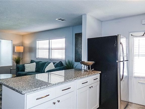 Very nice newly renovated and remodeled manufactured home for sale in the resident owned community of Ranchero Village Largo, FL. This is an absolutely beautiful home that includes the co-op share and is located in the dog section, allowing 1 dog to 30 pounds or 1 inside cat. This home has not been occupied or lived in since the renovations. This home has been completely remodeled with an open plan floor providing modern open space living. All walls in the home are a clean and modern drywall style finish while all the floors are a beautiful wood laminate and tile in the kitchen, bathrooms, and laundry room. The kitchen has new cabinets, granite countertops, double bowl stainless steel sink, tile backsplash, tile flooring, and stainless steel appliances with a nice large window above the sink. There is also a convenient access door directly off the kitchen to the carport for easy access when bringing in groceries. Directly next to the kitchen is a comfortable dining room area that fits a four seat dining room table with two large vertical windows bringing in plenty of natural light. The master bedroom accommodates a large king size bed, double closet plus a linen closet and a third smaller closet offering plenty of space for clothes and storage. The master bathroom has been upgraded with a new vanity, tile flooring, new tub and shower bath, new toilet, new faucets and lighting. The guest or hall bathroom has a new vanity with double bowl sinks, two mirrors above each sink for his and hers and granite countertops with new faucets and lighting. The bathroom also has new tile flooring, new toilet, plenty of lines storage and features a tub and show bath. The second bedroom is a very nice size with two vertical windows and two regular sized windows offering plenty of light and bright sunlight with a closet. Directly through the living room is a fully finished sunroom and living area just like the other areas of the home with a large utility room with washer and dryer hookups closed off by bi-fold doors with tile flooring and a door to the carport with four windows offering tons of natural light. There is currently a handicap ramp at that door that can be removed if not needed. In the rear, you will enjoy the large 12x26 foot paver patio area. Landscape areas on the front and the side ready for your planting. Exterior of the home has been improved with a roofover and vinyl siding. A New A/C unit and electric panel has been installed. This home is shown with furniture for staging purposes only and not offered furnished or with shown furniture in the final sale. Ranchero Village has an impressive amenity package that includes 3 pools, 3 clubhouses, spa, saunas, fitness center (new fitness center coming), 10 court shuffleboard, mini golf, tennis, bocce ball, pickleball, horseshoes and covered gazebo extending into the North Lake. Bike ride, golf cart or walk on the private streets of this manicured 127 acre community in the center of the Tampa Bay region. A short drive to 2 international airports and award winning beaches. Lot rent includes; water, sewer, trash, lawn care, and all community amenities.