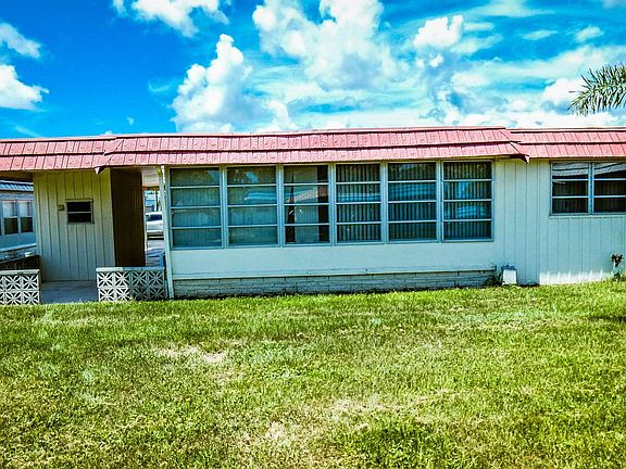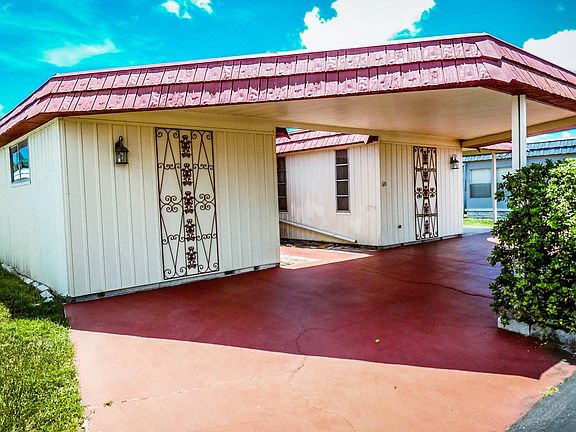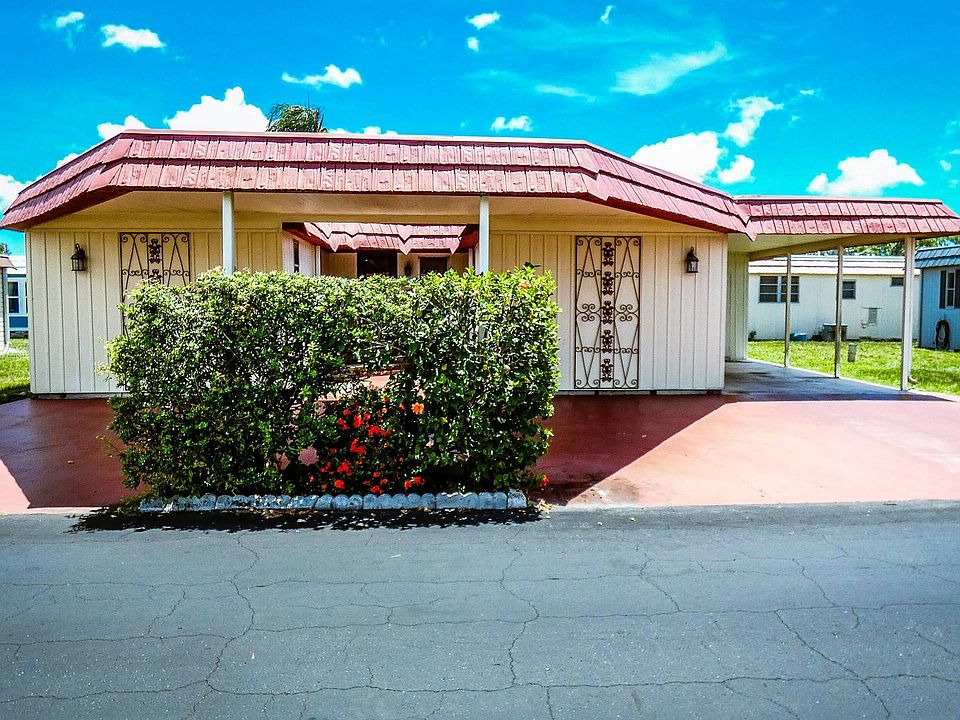This triple wide fixer-upper manufactured home is the much sought after 2 bedroom model (split plan), with 2 full baths. Additionally, this home has a large 4 car canopy parking. Whether you are an investor, buying the home to renovate and resell or a purchaser for personal use, the upside in value is definitely there. After removal of the old carpet, you will find plywood subflooring. A couple of coats of paint on the kitchen cabinets and the kitchen has a completely different look. The total square footage including the Florida room is approximately 1,350 square feet. The central air and heating system is a split system and blows cool. There is a wall unit a/c in the Florida room. Washer and dryer hookups in the shed. The Florida room looks onto a large open space area with a gazebo. 1 indoor cat permitted. Ranchero Village has an impressive amenity package that includes 3 pools, 3 clubhouses, spa, saunas, fitness center (new fitness center coming), 10 court shuffleboard, mini golf, tennis, bocce ball, pickleball, horseshoes and covered gazebo extending into the North Lake. Bike ride, golf cart or walk on the private streets of this manicured 127 acre community in the center of the Tampa Bay region. A short drive to 2 international airports and award winning Gulf of Mexico beaches. Monthly HOA is only includes; cable t.v., high speed internet, sewer, trash, lawn care, and all community amenities.