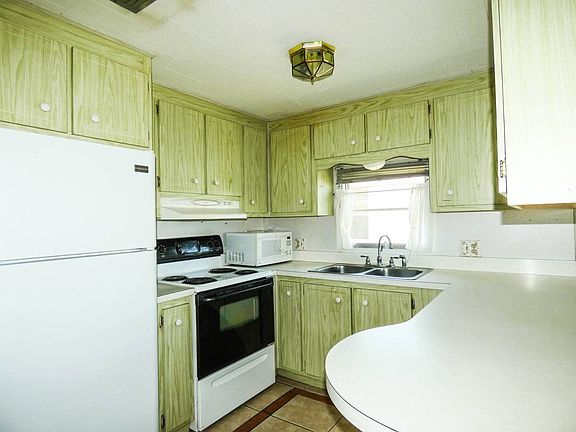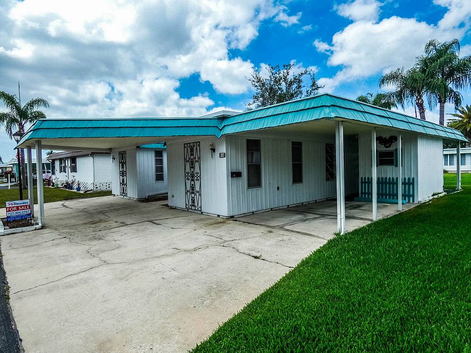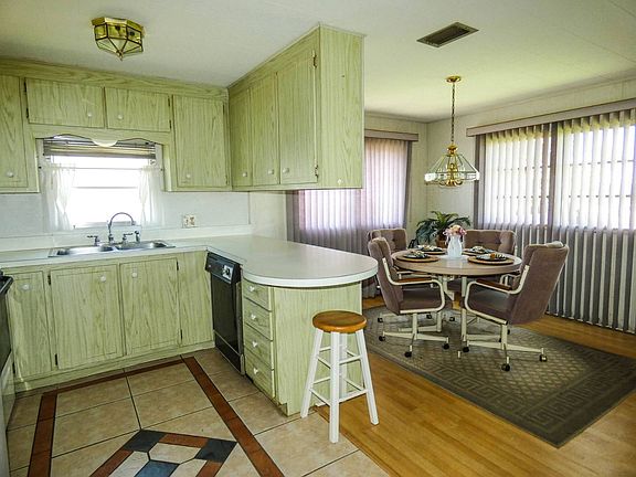 2 bedroom 2 full bath split bedroom plan triple wide mobile home with a roof over. The floor plan of this home is like a single family home. On the outside, you have a large canopy providing cover to the 3 to 4 car parking area with an open area over the formal entry walk flanked on both sides by a landscape planting area. You then step onto the front porch with railing to the living room. Inside, the 20 foot long living room is complemented by the 2 sliding glass doors to the Florida room looking onto the open space area with a gazebo. There is a third sliding glass door to the Florida room from the formal dining room with corner cupboard. The kitchen has plenty of counter space and cabinets. One of the two closets in the hallway next to the kitchen provides a kitchen pantry. The full tub and shower bath is next to one of the bedrooms. The other bedroom is on the other side of the living room. Every room has wood laminate flooring except the kitchen and hall, which are ceramic tile. 1 indoor cat allowed, no dog. Ranchero Village is a premier 55 plus resident owned community centrally located in Pinellas County, close to shopping, medical, VA, restaurants, entertainment, beaches and 2 international airports. Amenities include 3 clubhouses, 3 pools, saunas, spa, tennis, bocce ball, pickleball, fitness, horseshoes, shuffleboard and billiards. The monthly fee includes cable, internet, garbage and recycling pick up, lawn mowing and trimming and sewer.