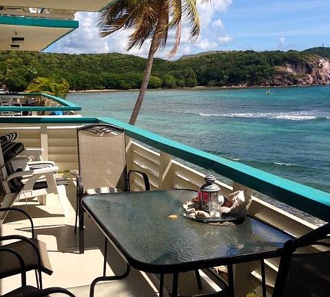 MLS # 15-548 Watergate Villas East, Bolongo Beach, St. Thomas US Virgin Islands Unit #17-22 Prime Oceanfront Villa 17 that is directly adjacent to beach and pool. Fully furnished and ready to move in or rent for short-term vacation or long term. Unit has a successful short term rental history and maintained by 1 original owner since being built. Condo Fee Amt (HO Association Monthly): 670 includes exterior insurance + 50 for exterior audio/video surveillance;Unit Location: Middle; General Condition: Excellent; Water Fee: 0.04/gallon; Pets Allowed: Yes (small pet with board approval for owner. View: French Cap/STX; Ocean; South Shore; Waterfront: Sandy Beach Amenities: Cable TV ready; Deck; 3 Pools, 3 Restaurants; Tennis Court; X-Amenity: Watersport rentals Flooring: Tile Bedrooms (2 total): 2BRs. King & 2 Twins; Bathrooms (2 total): # Shower: 1; # Shower/Bath: 1 Living/Dining: Seating for 6; # Rooms: 7; SqFt: 1,075 Construction: Concrete Block Appliance: Range: 1; Refrigerator: 1; Microwave: 1; Laundry: Coin Operated; Air Conditioning: 3; Fans: 3 Exterior: Color: Off-white/Caribbean Teal; Roof: Concrete; Construction: Concrete Block; Water: Cistern; Sewer: Sewer Plant; Cistern: Common; Road: Paved; Landscape: Mature; Terrain: Beach Front; Security: 24 Hour Monitor; Beach: Sandy and coral reef for snorkeling; Storm Shutters: Accordion; Off Street Parking: Yes Unit 1 Info: Kitchen: Fully equipped; Financial Info: Min Dep Req: 10%; Terms: Cash Unit Info: # Parking: 1; Individual Meters: Yes