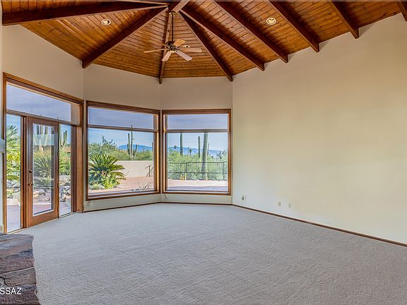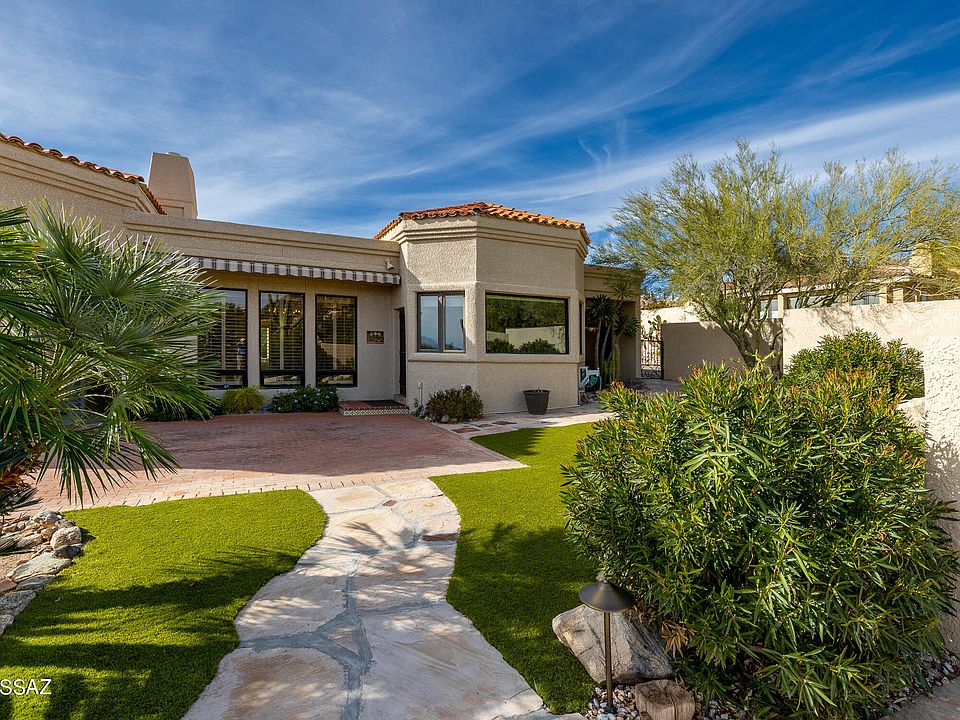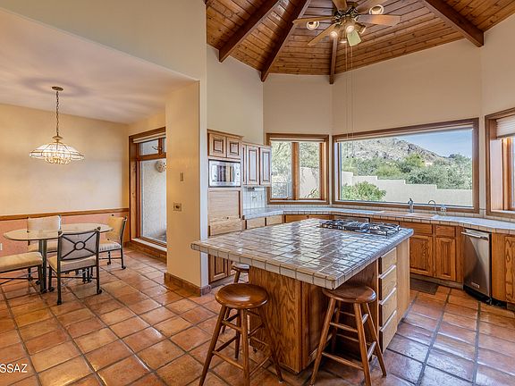 Well maintained secluded home, in Gated community,is a traditional Santa Fe inspired design.Nestled in heart of Catalina Foothills w/Mountain & city views. Floorplan & decor has many windows, Saltillo tile, wood beamed ceilings, Wine Frig, Flagstone Fireplace, Formal Living & Dining Rooms, Family Room w/custom built-ins throughout. Kitchen has large walk-in pantry, built-in desk, dining nook w/built-in hutch, newer Stainless Steel appliances; dbl wall oven, microwave, trash compactor, water filtration system & original sub-zero refrigerator. Back brick patio has entertained many graduations, weddings, & parties over the years. Custom built of block stucco, dual zone cooling of AC & evap; Mission Tile treatment to Built up roof; hidden safe, solid core doors, & new motor for 2-car garage.