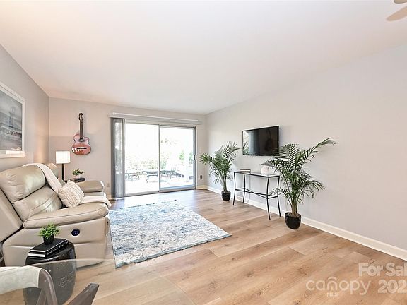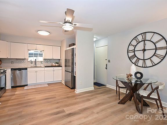 This updated 1 bedroom, 1 bath condo is located on the main level in the beautiful Quail Hollow Estates community. Unlike other communities, buildings are spaced out, offering scenic views. LVP flooring was added in 2024, & the coat closet was converted into a study. Spacious great room, kitchen trimmed with white cabinets, granite & butcher block countertops, & a relaxing porch to enjoy. This unit comes with 2 assigned spaces. One assigned carport space & one allocated parking space. The monthly HOA dues include water, sewer, heating/cooling, & exterior maintenance. A new handler 2021 in the unit connects to the building's community boiler/chiller system. The stackable washer/dryer & refrigerator convey. The community features an outdoor pool, clubhouse, tennis courts, pickle ball court coming soon, a pond, and sidewalks. Fabulous location with convenient access to Quail Corners Shopping Center, South Park Mall, dining, Little Sugar Creek Greenway, & Blue Line Lightrail station.