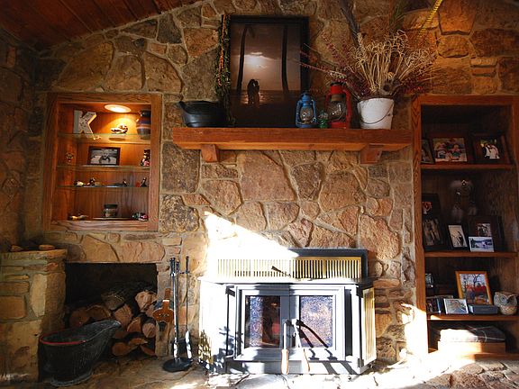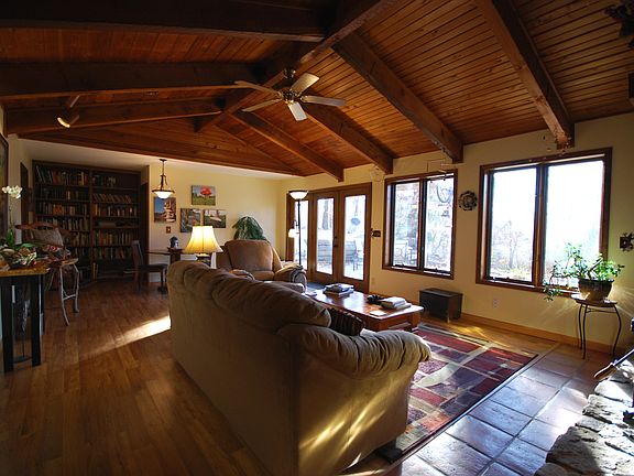 Great home for the nature enthusiast! Super-efficient earth berm home on 68 acres has lots of character with exposed beam ceilings, rock fireplace and an interior wall built with the wood from a log cabin previously on the property. Other features include two bedrooms, two bathrooms, an office, wood floors, walk-in closets and sky lights for added natural light. There's even a cave, natural spring and wet weather creek just below the home. Enjoy the quiet serenity from the expansive deck overlooking the Ozark Mountains or spend the day unwinding in the fenced garden. Just 15 minutes to Ozark or 30 minutes to Branson.